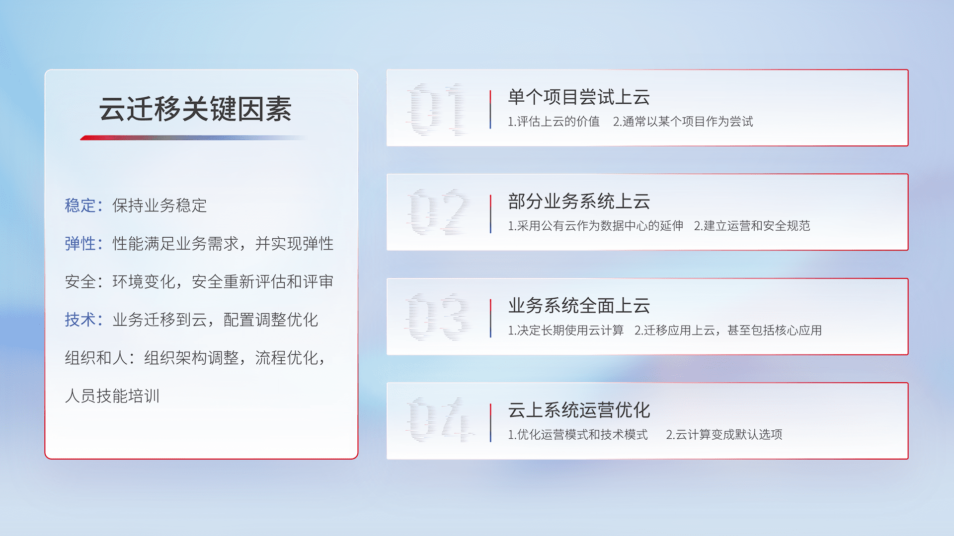 结合实际业务,,从规划设计、、、、云平台选型、、云原生改造、、、数据迁移、、、、集成交付,,,,迁移全过程为客户识别最佳上云路径,,做好风险识别管理,,设计网络架构、、、身份权限、、、安全审计合规、、操作审计、、、、日志审计、、监控告警策略、、、多站点容灾设计等,,对云上基础设施进行整体规划,,提升IT治理水平,,,以满足弹性、、、高可用、、、高性能的需求。。